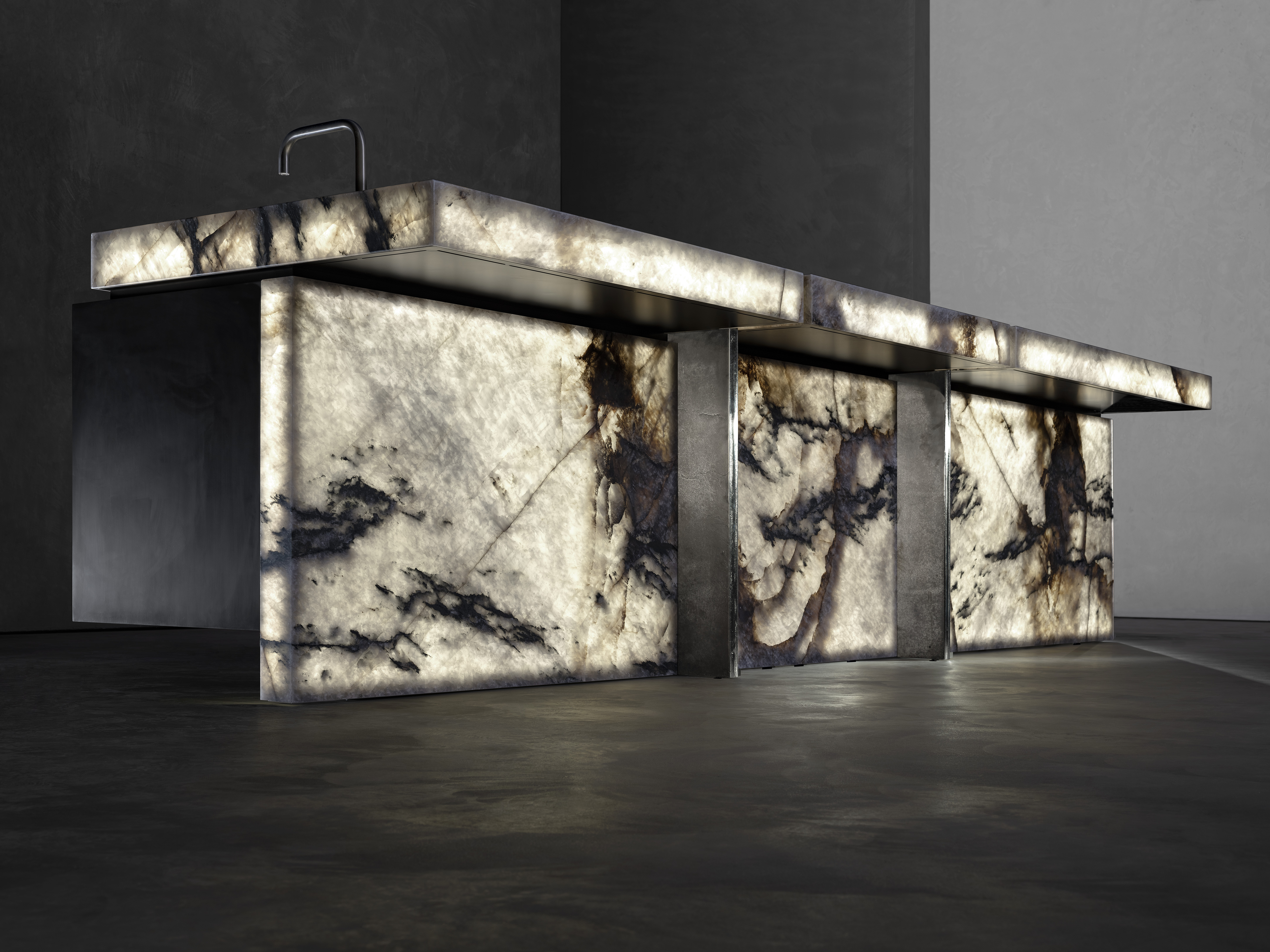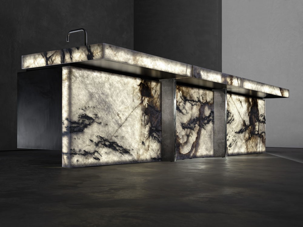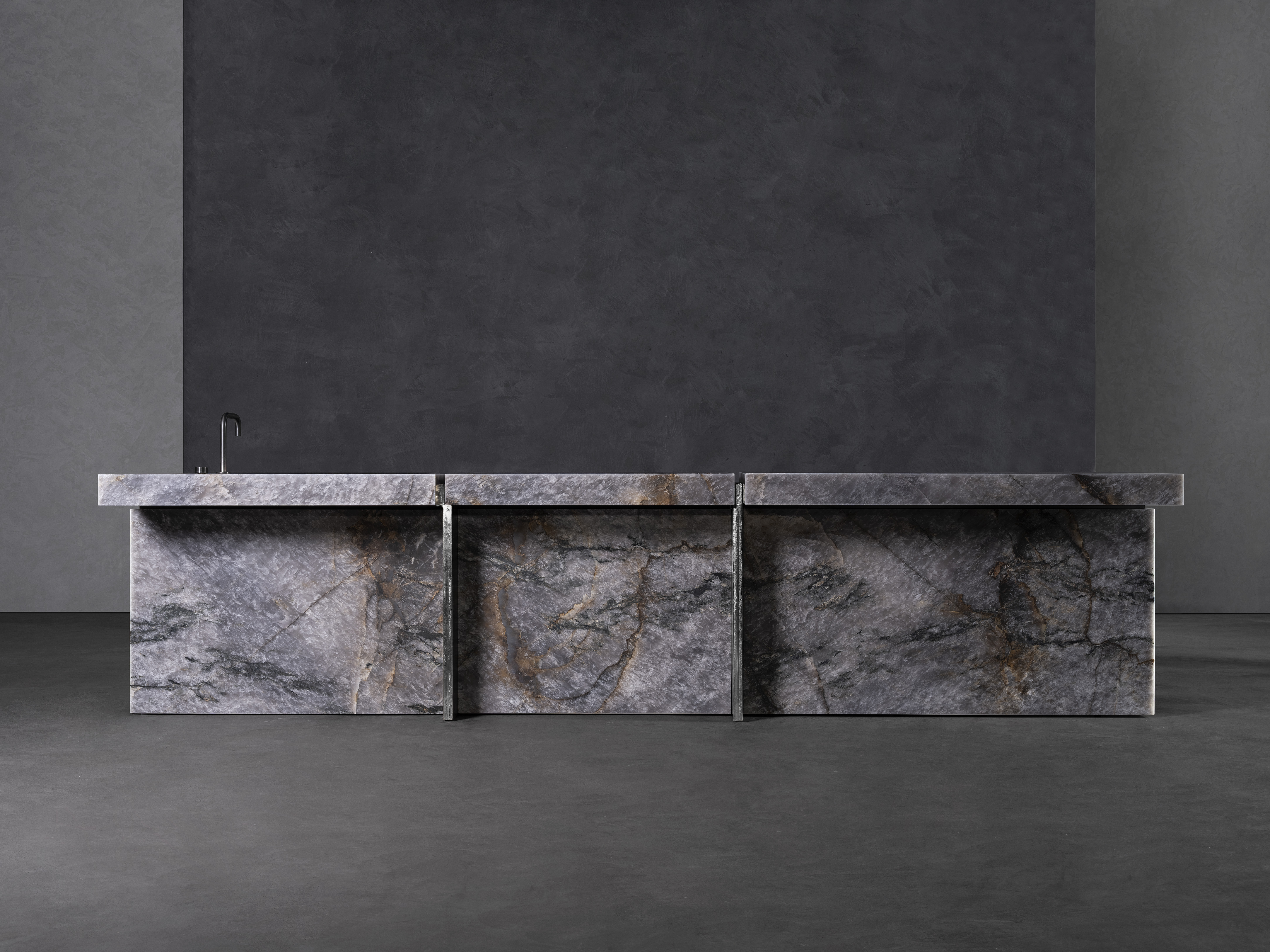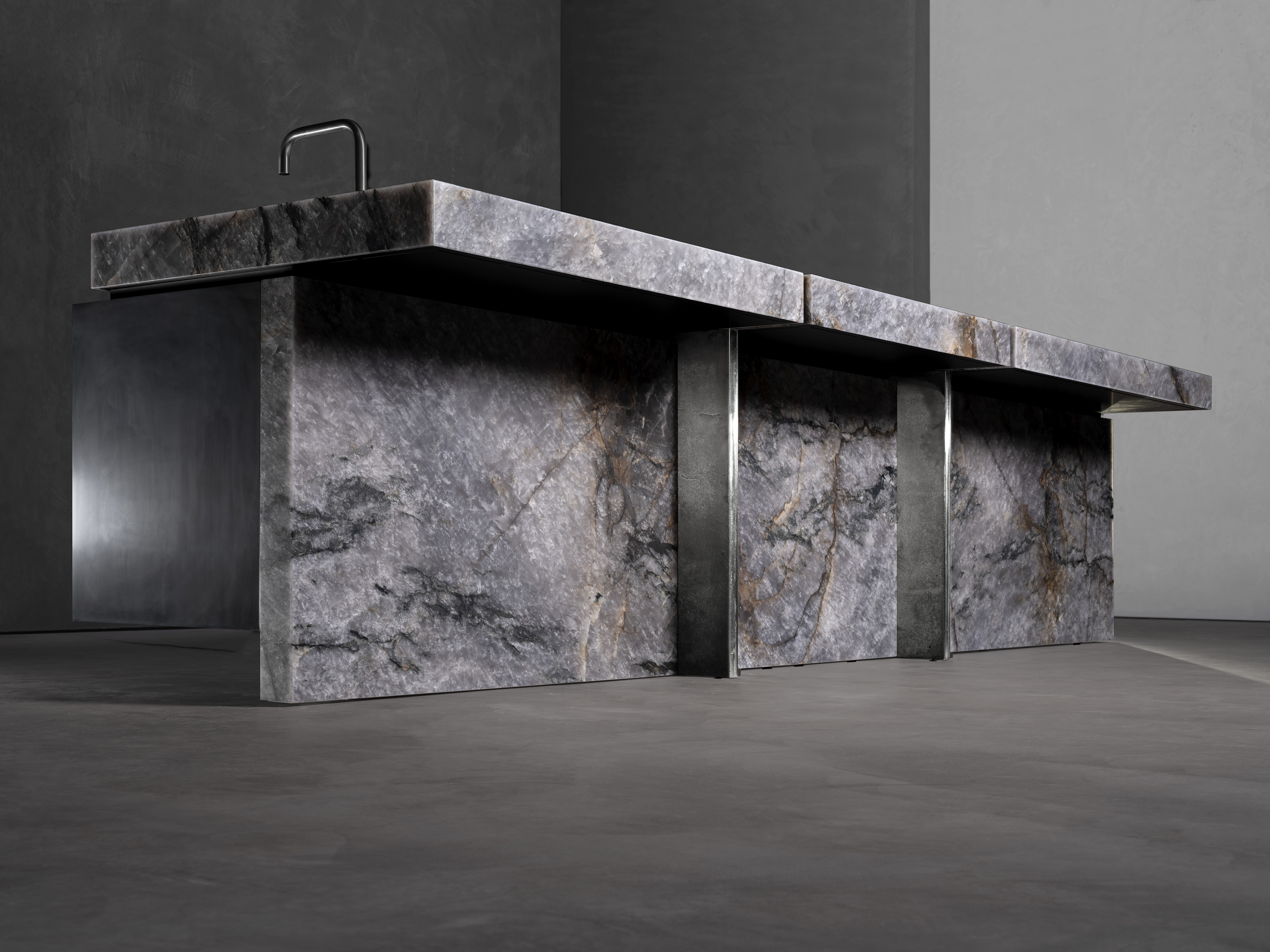 Odeon Suspended is a study in balance, mixing solid weight with a sense of lightness. A long natural monolith held up by recessed steel supports, creates the illusion of floating in mid-air. By defying gravity, Odeon Suspended turns the kitchen into a striking focal point, where the massive marble block seems to drift with sculptural elegance.