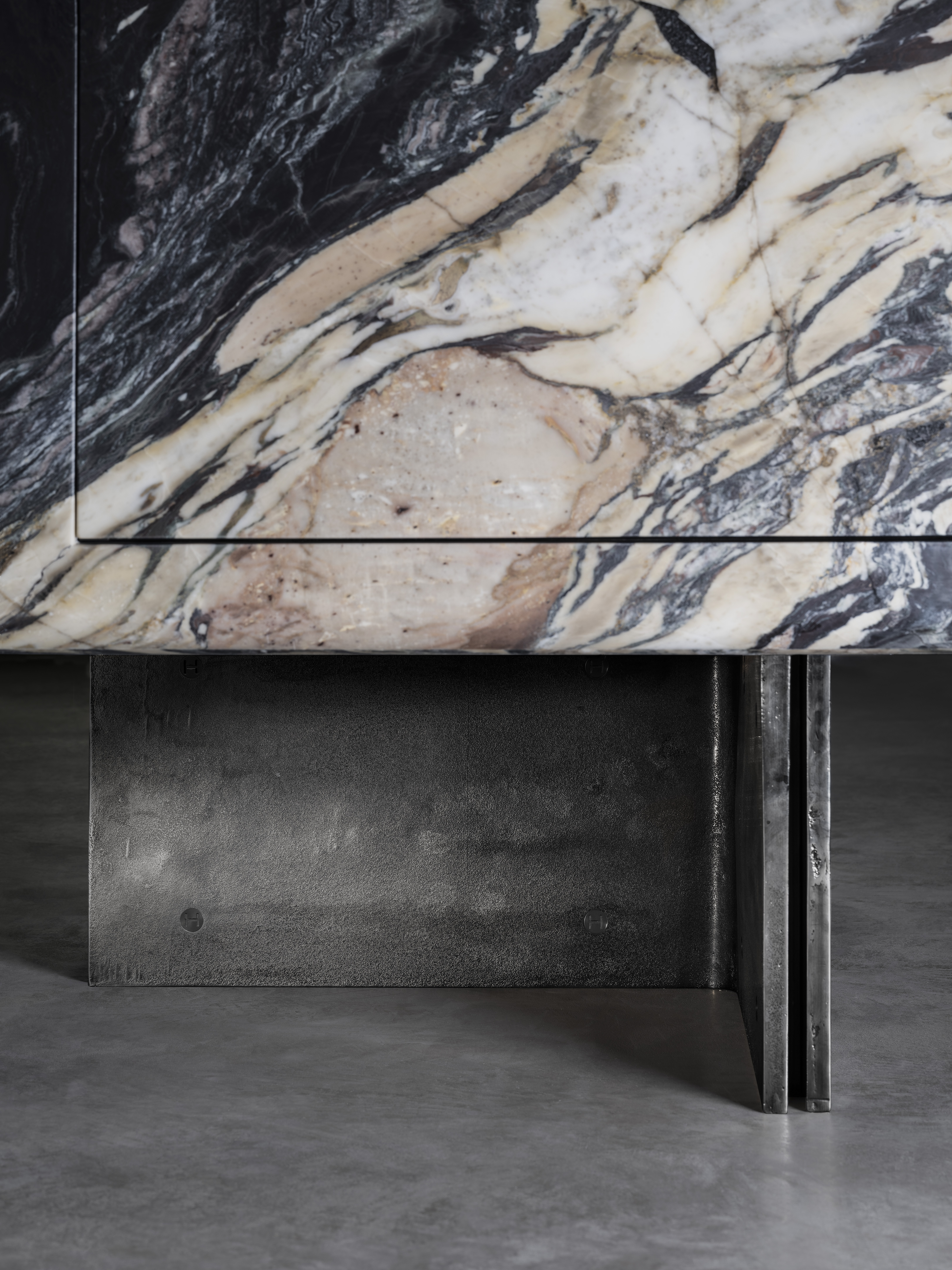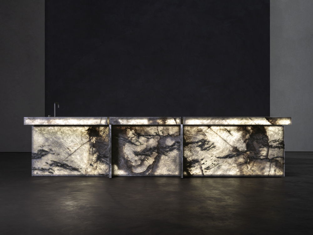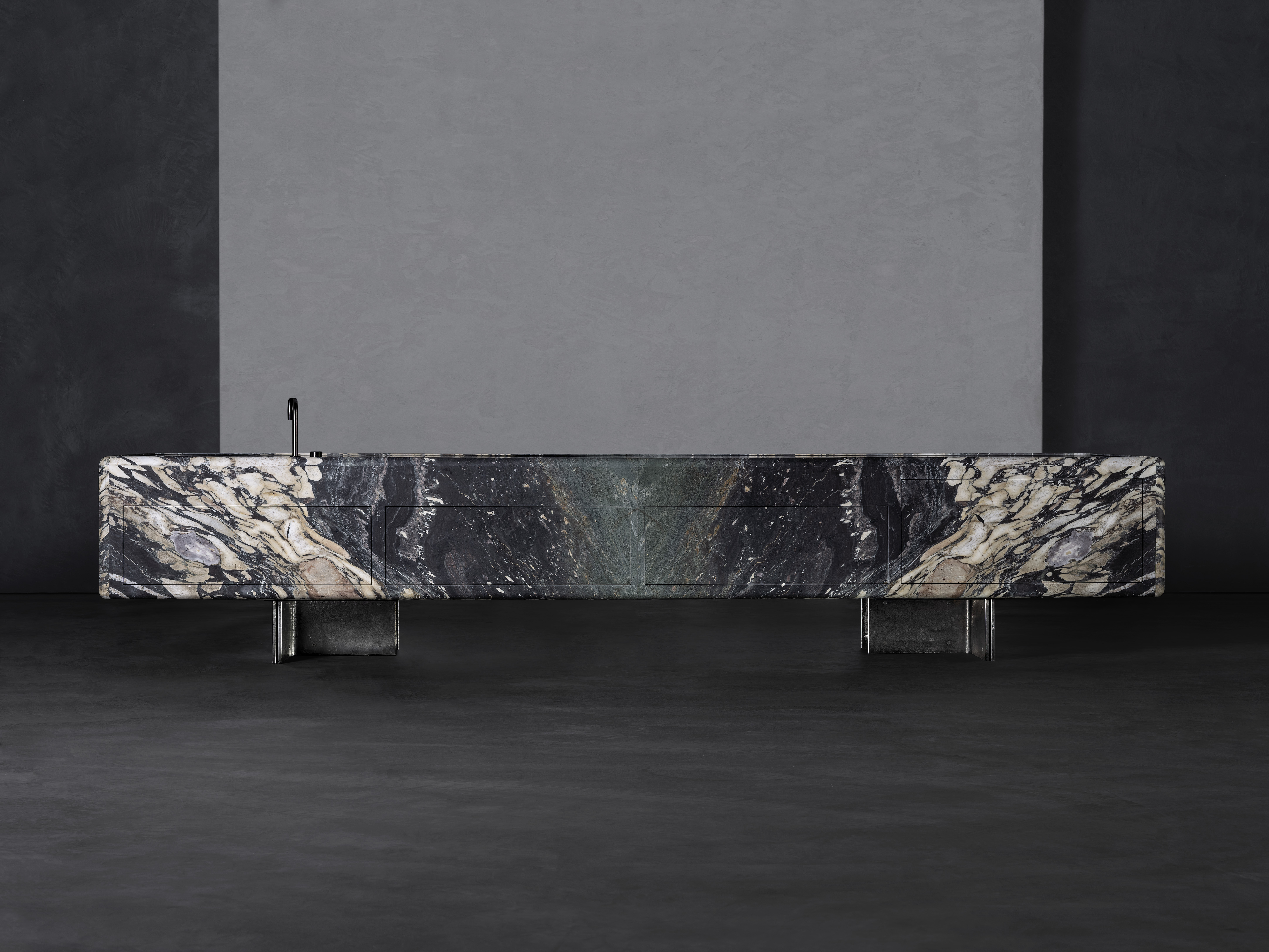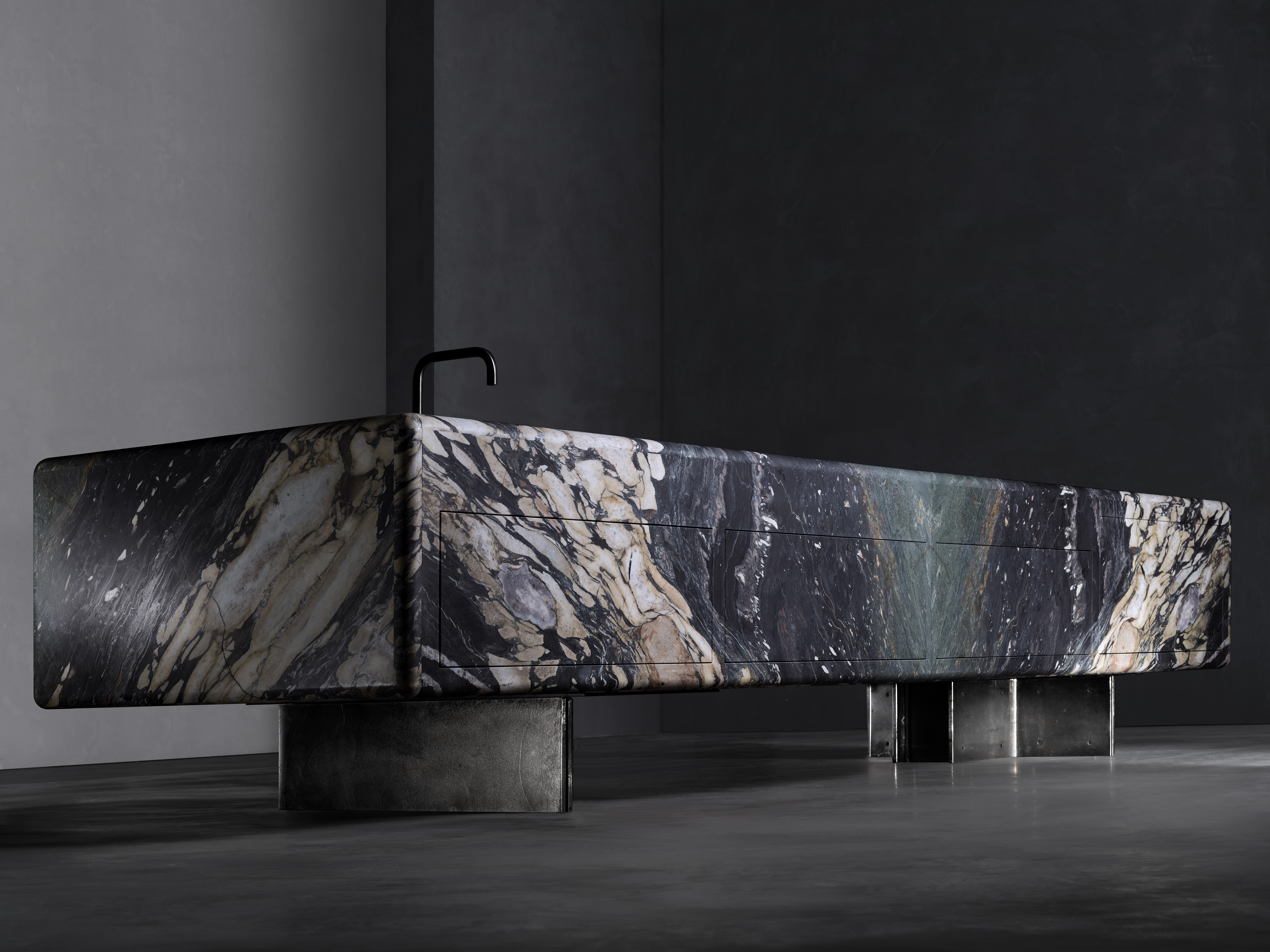 Odeon Suspended is a study in balance, mixing solid weight with a sense of lightness. A long natural monolith held up by recessed steel supports, creates the illusion of floating in mid-air. By defying gravity, Odeon Suspended turns the kitchen into a striking focal point, where the massive marble block seems to drift with sculptural elegance.