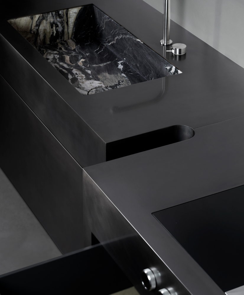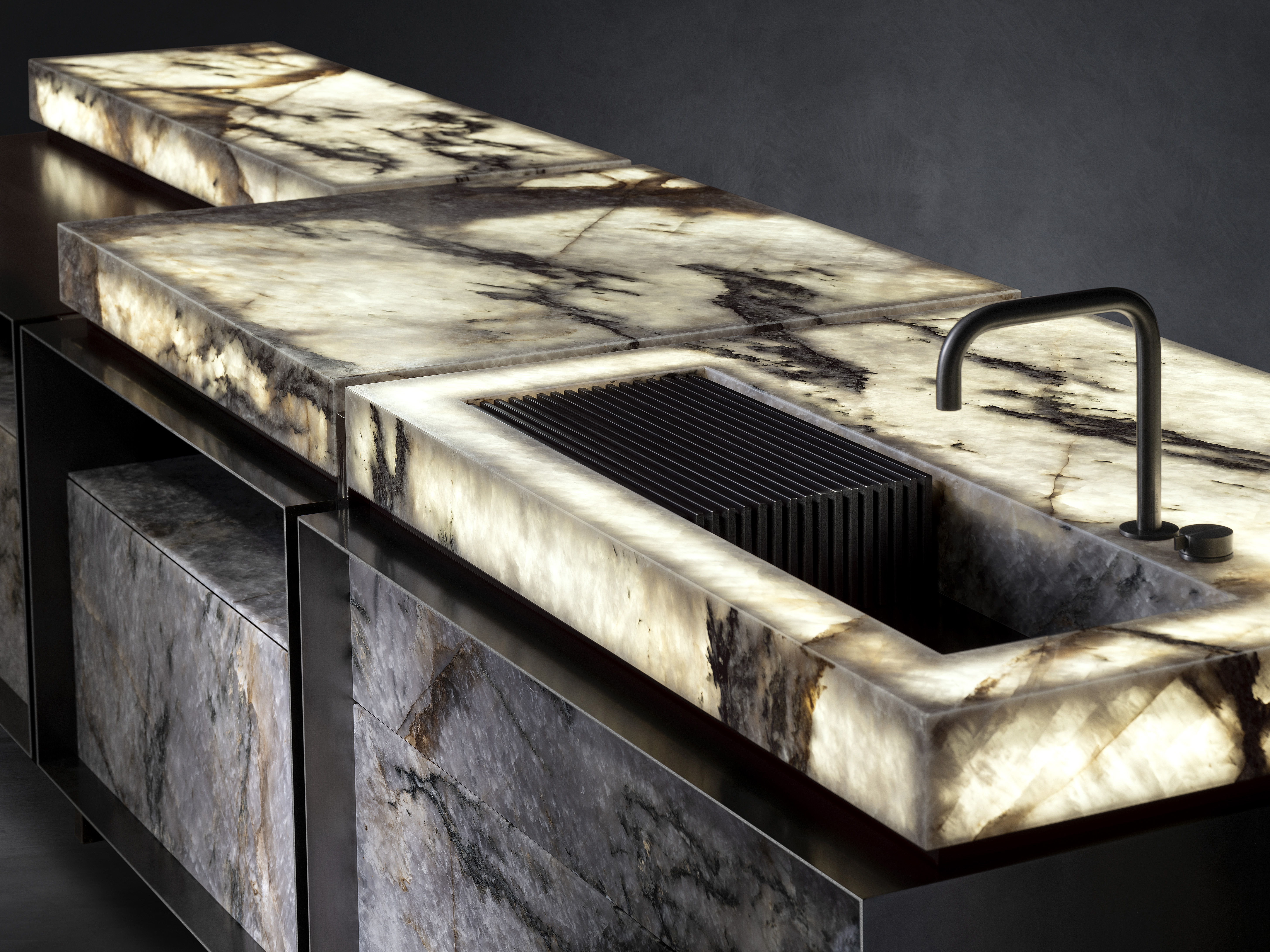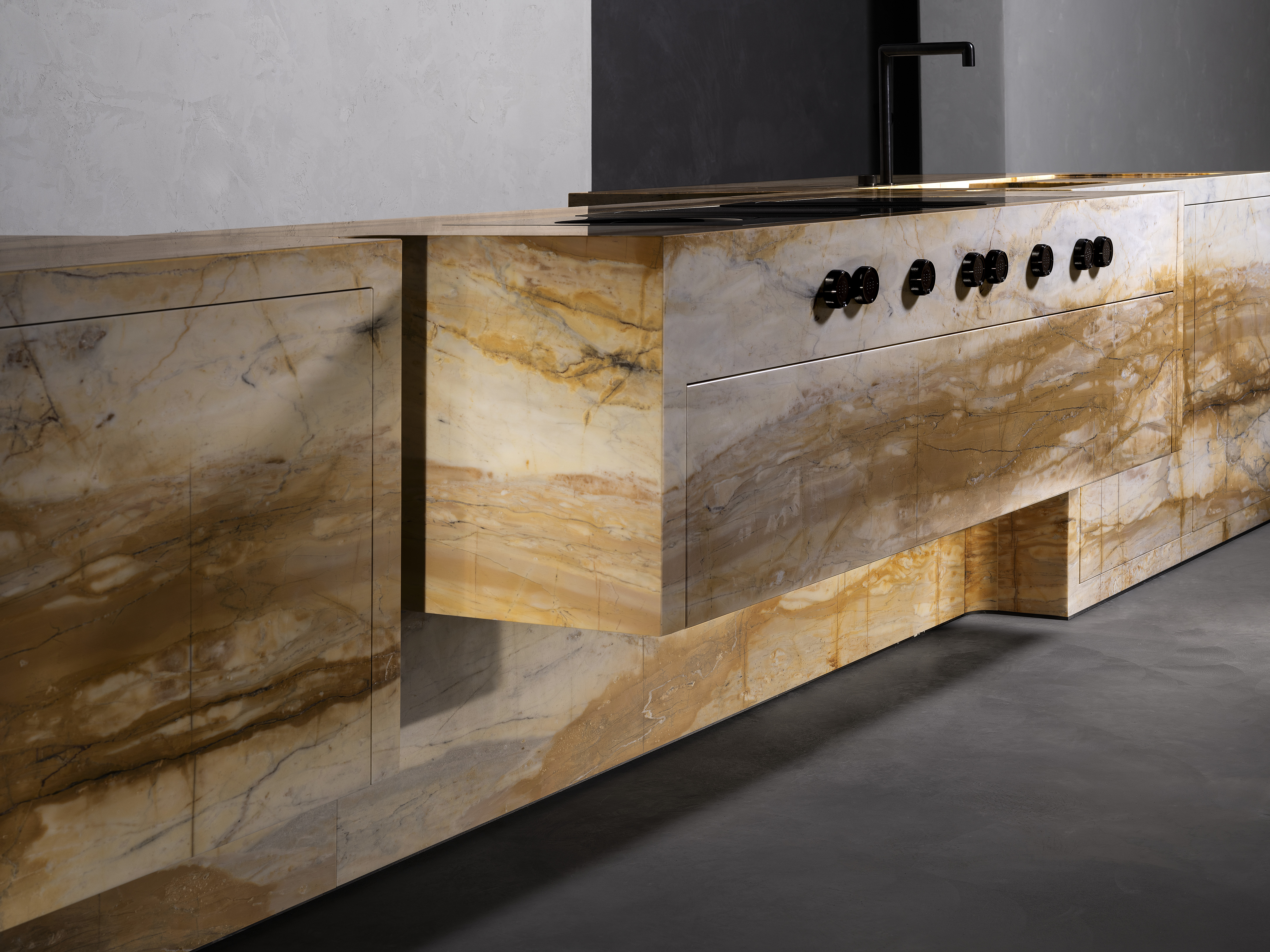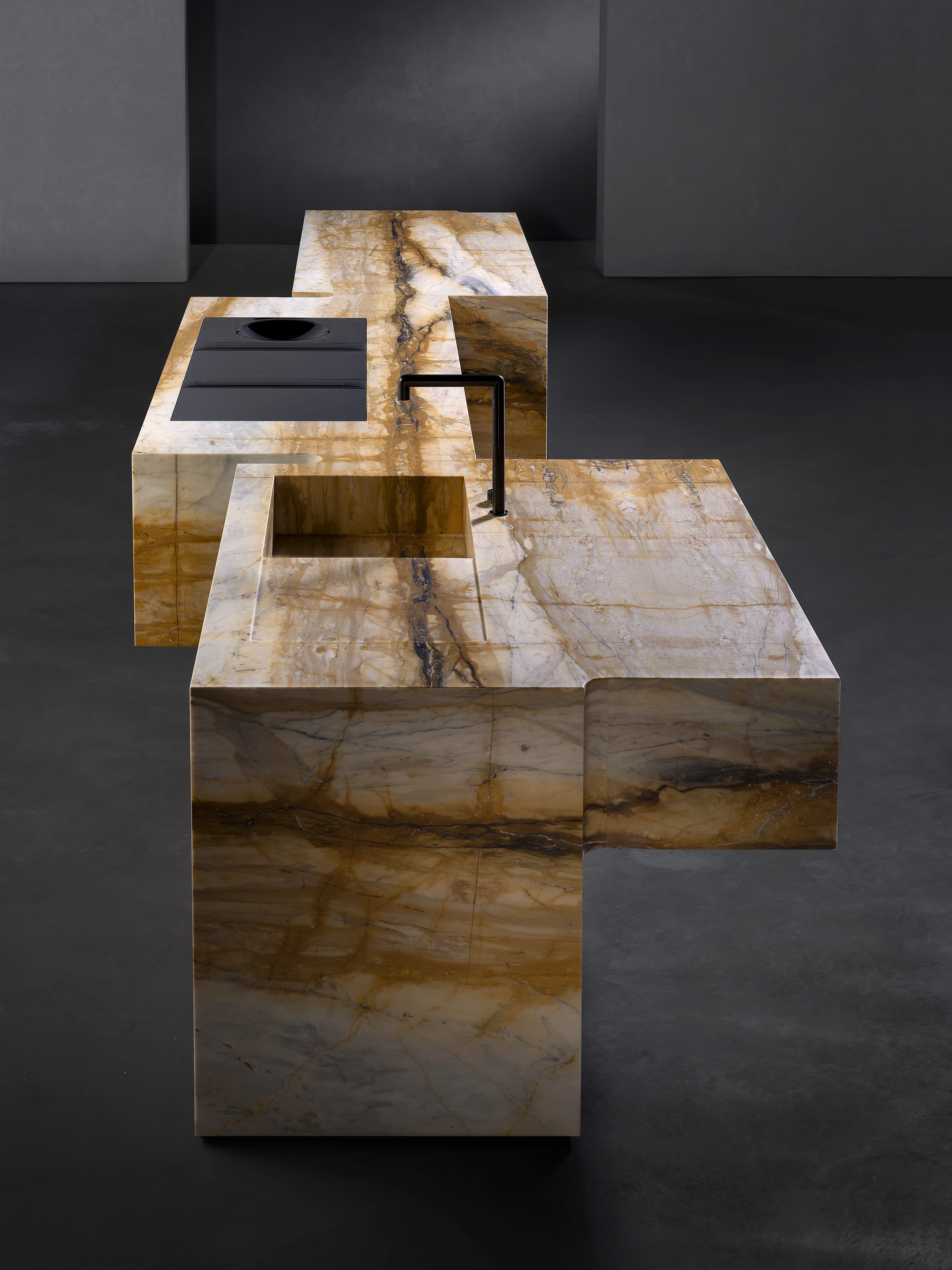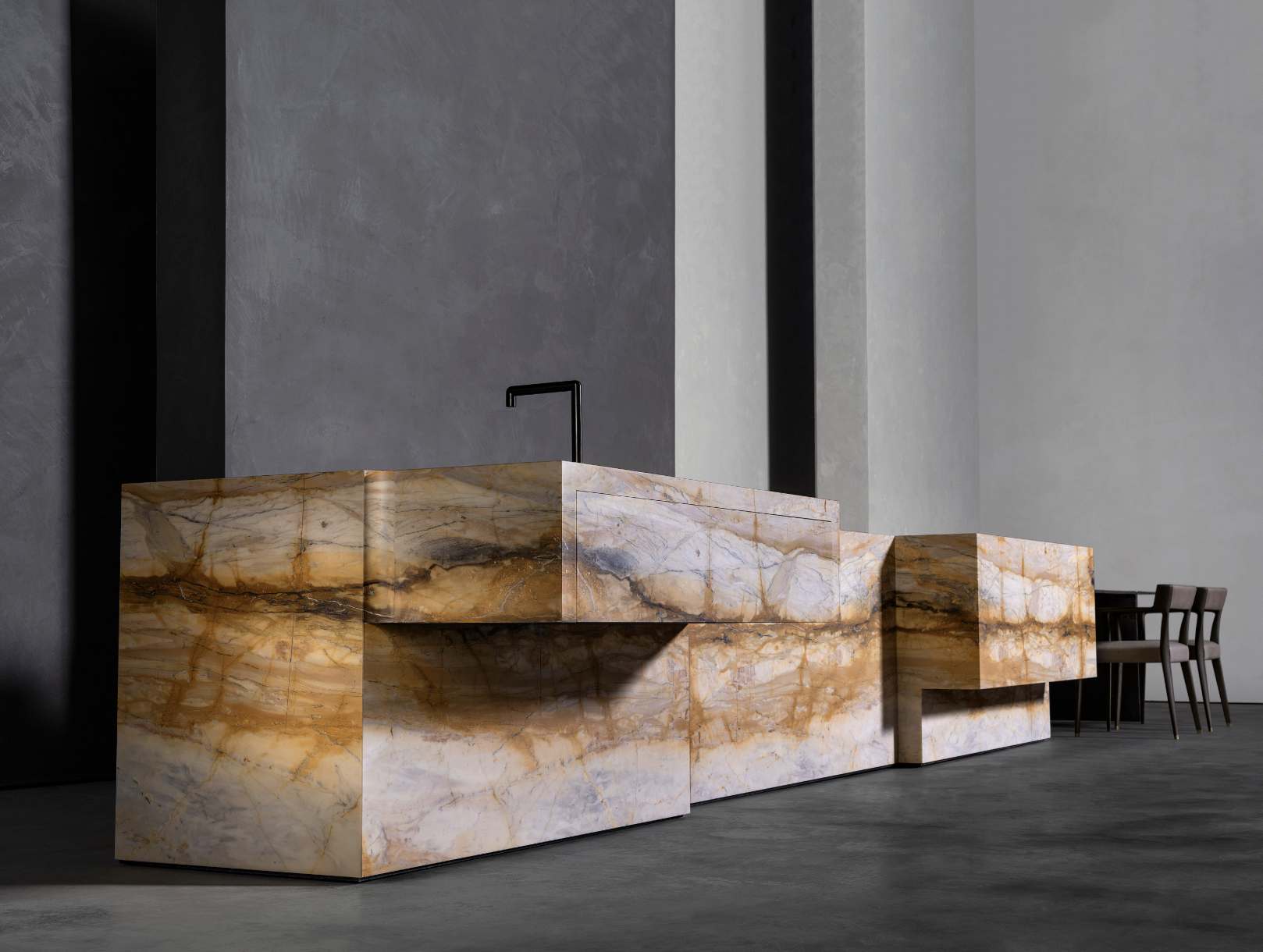 Opera breaks the rules of standard design. It’s a play of solid shapes and sharp edges, where sculpted profiles add rhythm to the massive marble block.The result is a sculptural kitchen that naturally draws people around the island. Here, the raw strength of stone creates a new kind of balance in the home.