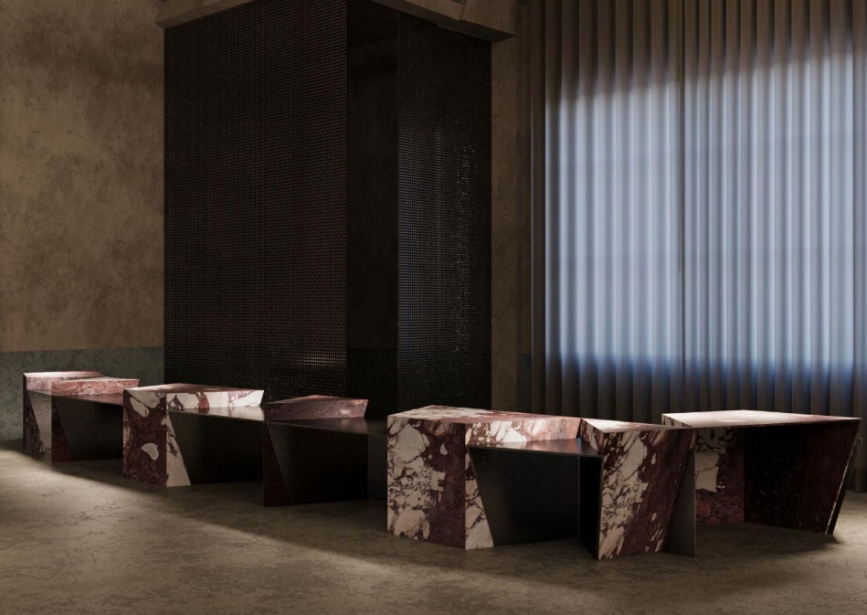 Rather than presenting individual pieces, Henge constructs a cohesive setting where material, light and atmosphere guide the experience. Stone and mineral surfaces, metal reflections, glass and calibrated lighting, together with textiles and leather seating, create a setting intended for comfort and permanence. Several elements are designed specifically for VOCLA, conceived not as display pieces but as functional components of a living environment.