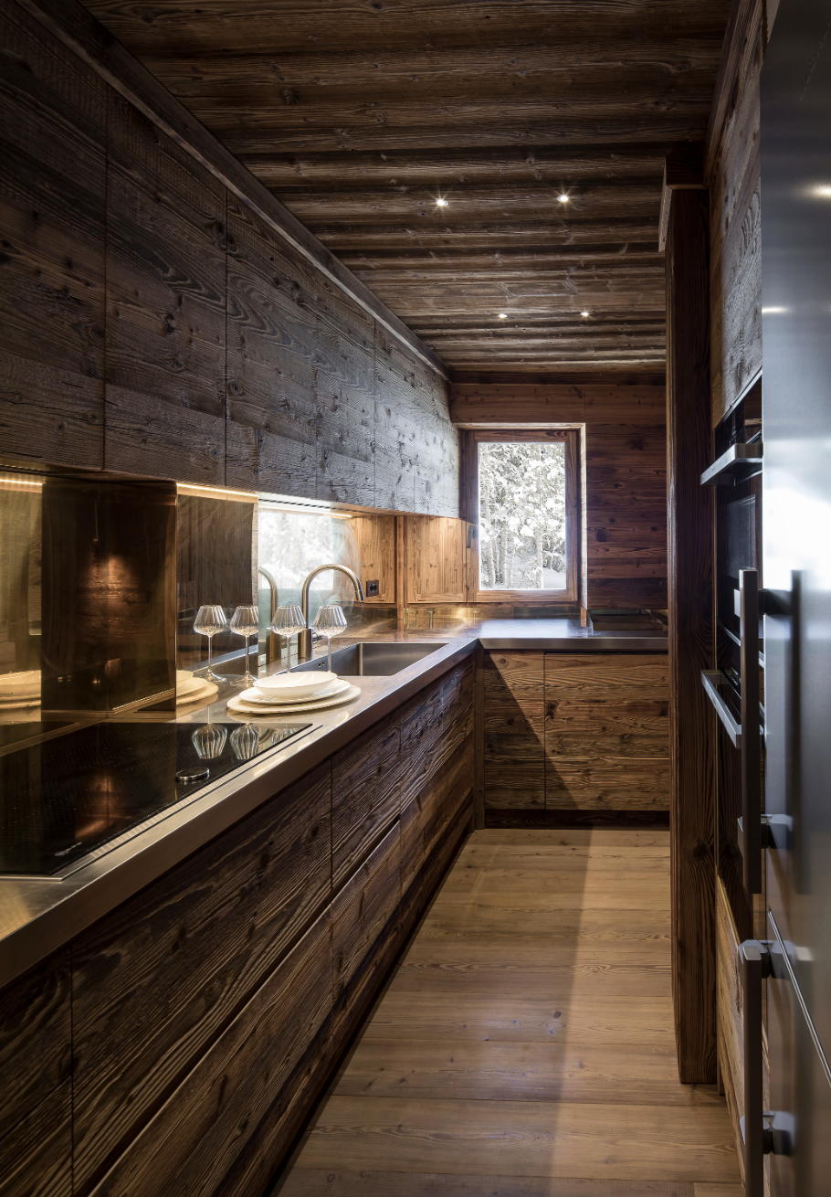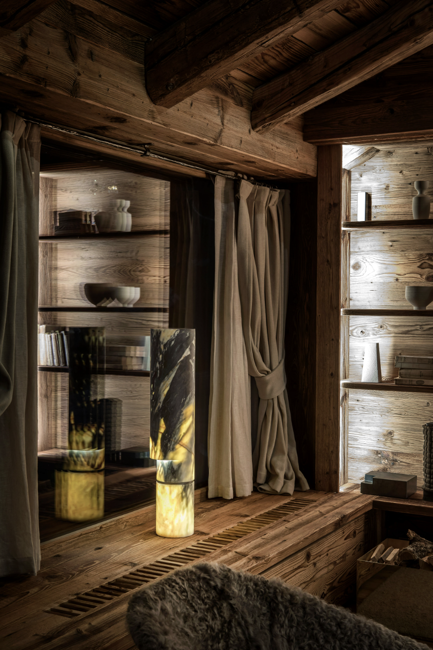 Costruito con legno di larice recuperato dai vecchi tabià, lo Chalet rispecchia la filosofia Henge: autenticità materica, equilibrio e continuità con il paesaggio. L’architetto Isabella Genovese ha mantenuto la coerenza estetica originaria, interpretando gli spazi in chiave contemporanea e funzionale.